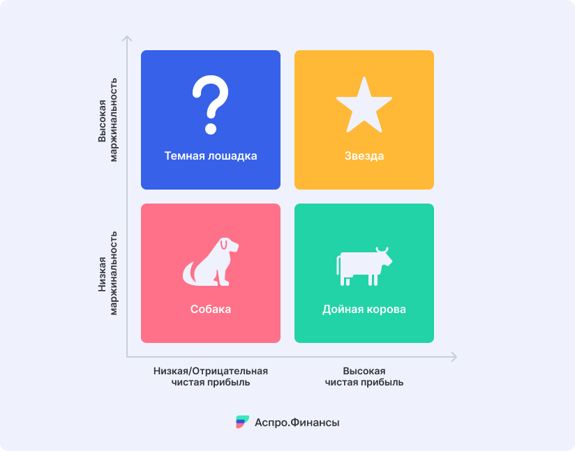 Дойная Корова: дает стабильный денежный поток, но не имеет высокого потенциала роста. Низкая маржинальность — признак высокой конкуренции или устаревшей модели.