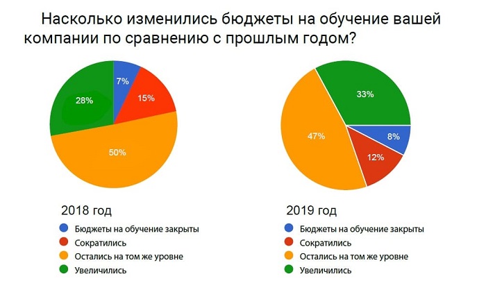 Бюджеты на обучение в 47% случаев остались на прежнем уровне, а 33% опрошенных отмечают увеличение бюджетов (против 28% в 2018, 21% в 2017 и 17% в 2016).