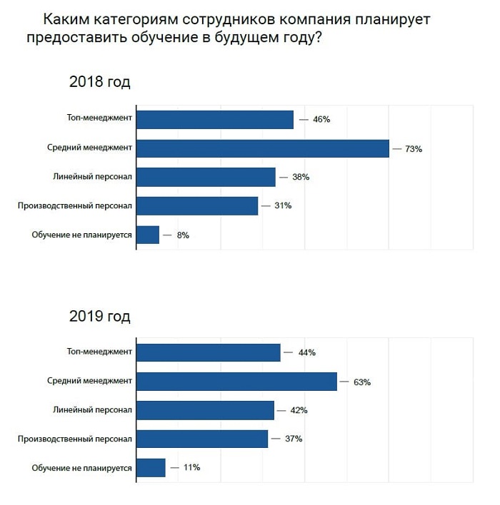 Уменьшение бюджетов на профессиональное обучение и развитие персонала наблюдают лишь 12% опрошенных (против 15% в 2018, 17% в 2017 и 24% в 2016).