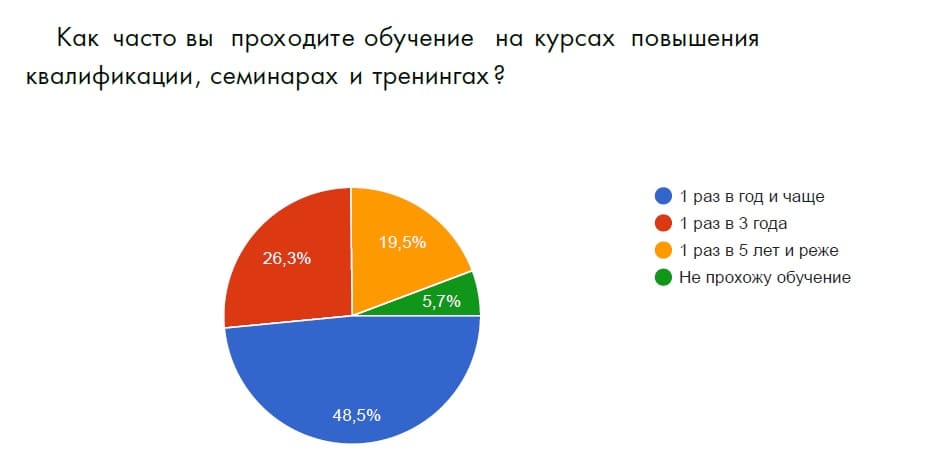 Большинство опрошенных проходят обучение 1 раз в год и чаще (48,5%). Остальные респонденты учатся 1 раз в 3 года (26,3%), 1 раз в 5 лет и реже (19,5%) или не проходят регулярное обучение (5,7%).