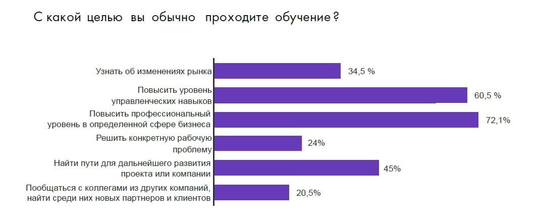Среди других целей обучения респонденты выделили поиск возможностей для дальнейшего развития проектов (45%), изучение последних изменений рынка (34,5%), решение конкретной рабочей проблемы (24%), общение с коллегами из других компаний (20,5%).