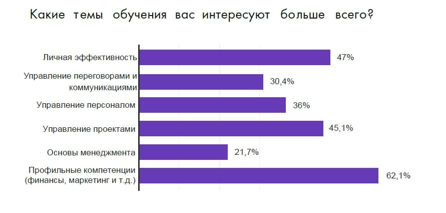 Согласно результатам опроса, чаще всего руководители идут учиться на курсы по профильным компетенциям (62,1%) и личной эффективности (47%). Управленческим дисциплинам они уделяют меньше внимания: управление проектами интересует 45,1% респондентов, управление персоналом – 36%, основы менеджмента – 21,7%.