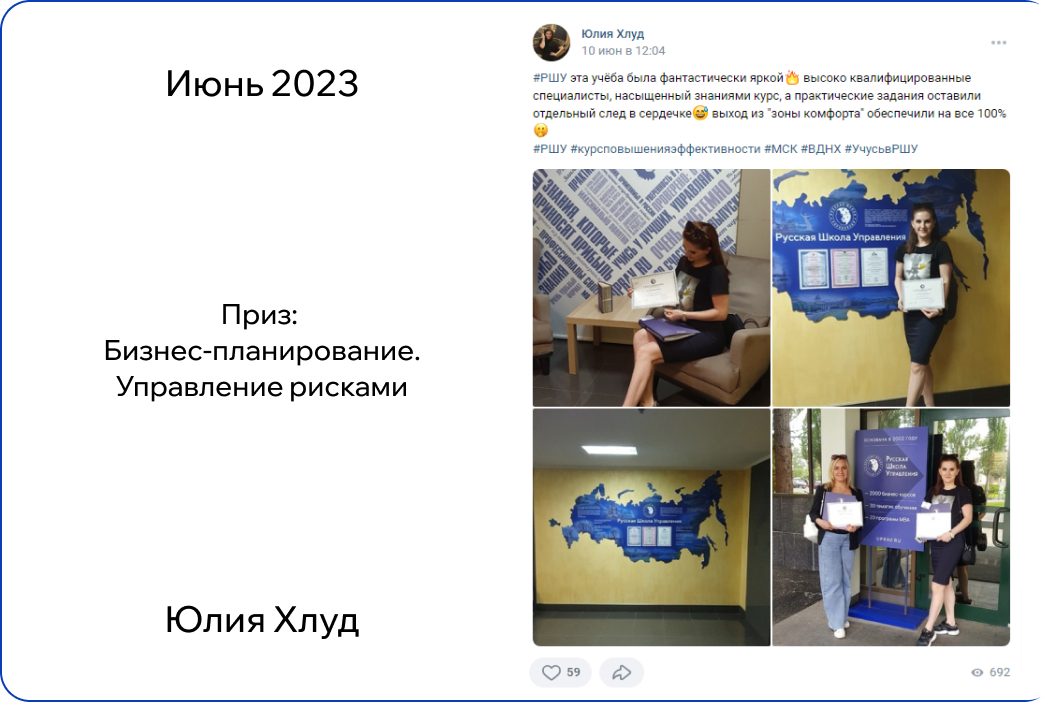 Выложите на своей странице во Вконтакте отзыв и фото с обучения в РШУ