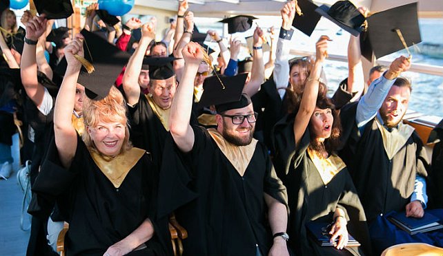 По традиции выпускники отправились на водную прогулку по рекам и каналам Санкт-Петербурга. На теплоходе собрались не только выпускники, но и преподаватели, которые в течение нескольких месяцев были наставниками участников Mini MBA.