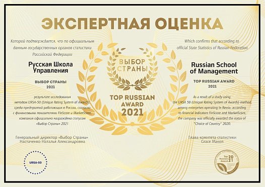Русская Школа Управления стала победителем премии «Выбор страны 2021» в номинации «Деятельность по дополнительному профессиональному образованию».